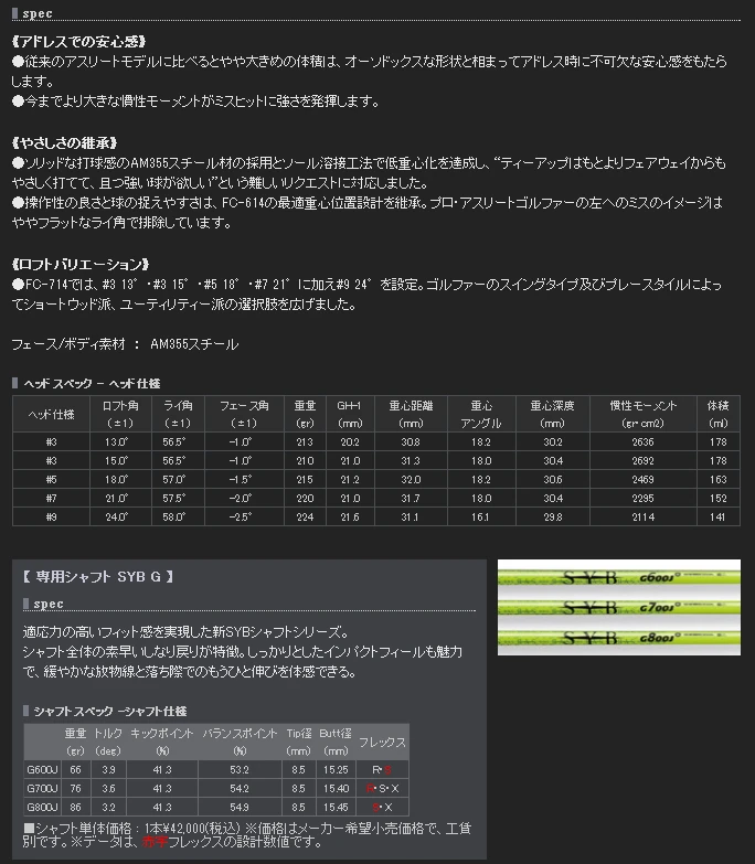 SYB Golf FC-714 Fairway Wood is designed with the advanced athlete players in mind. Â It features a traditonal head shape preferred by many low handicap and pro level players. Â The head is a good combination of distance, workability and forgiveness.
